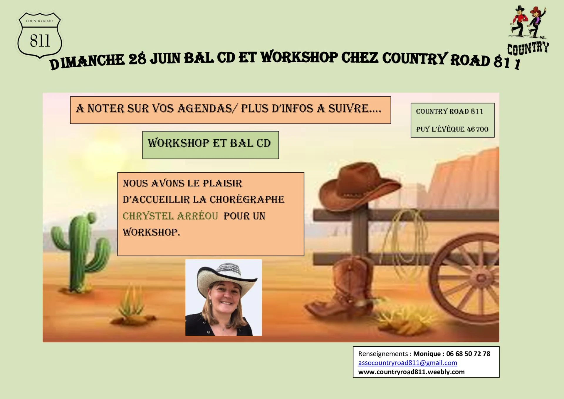Renseignements: Monique Tél : 06 68 50 72 78 ou assocountryroad811@gmail.com